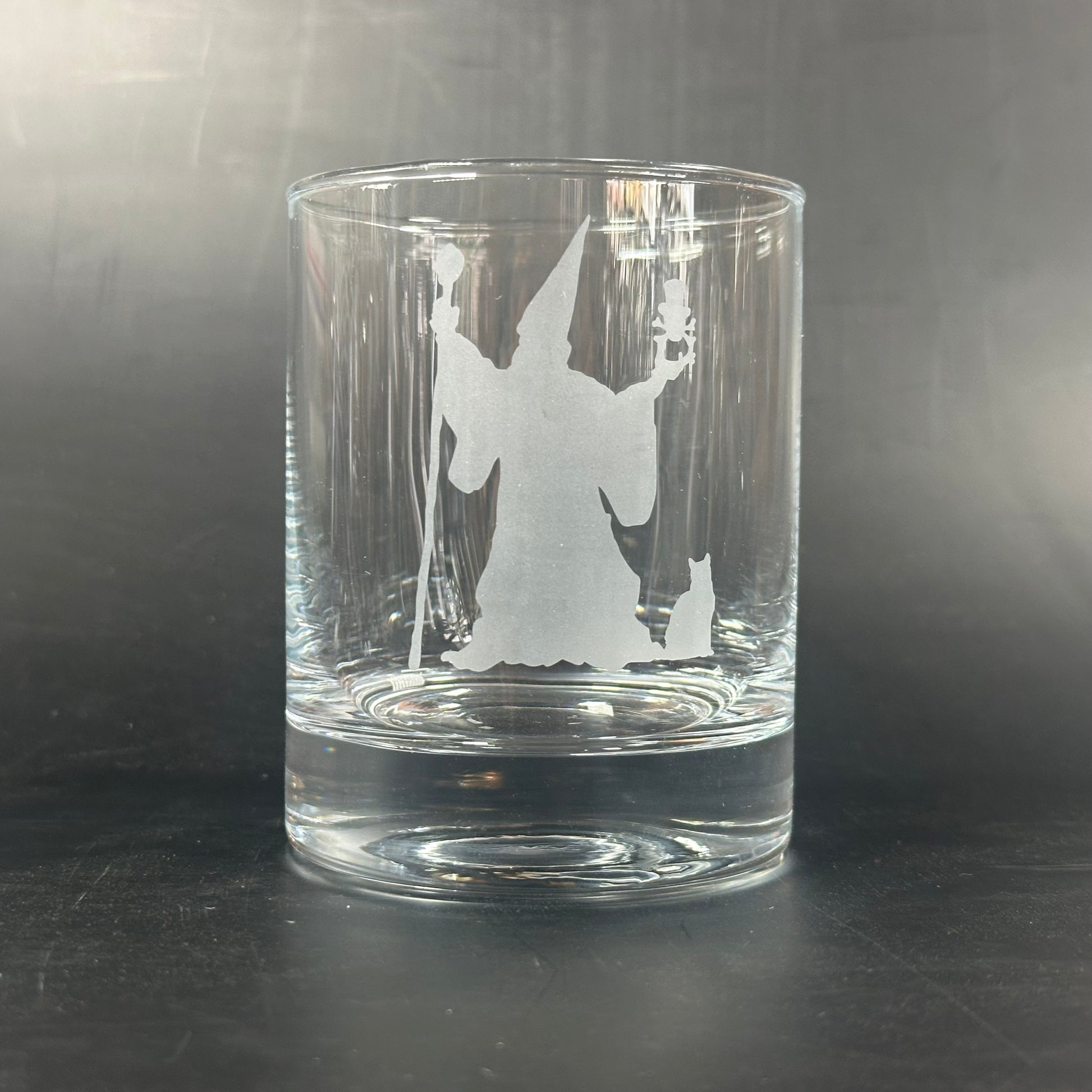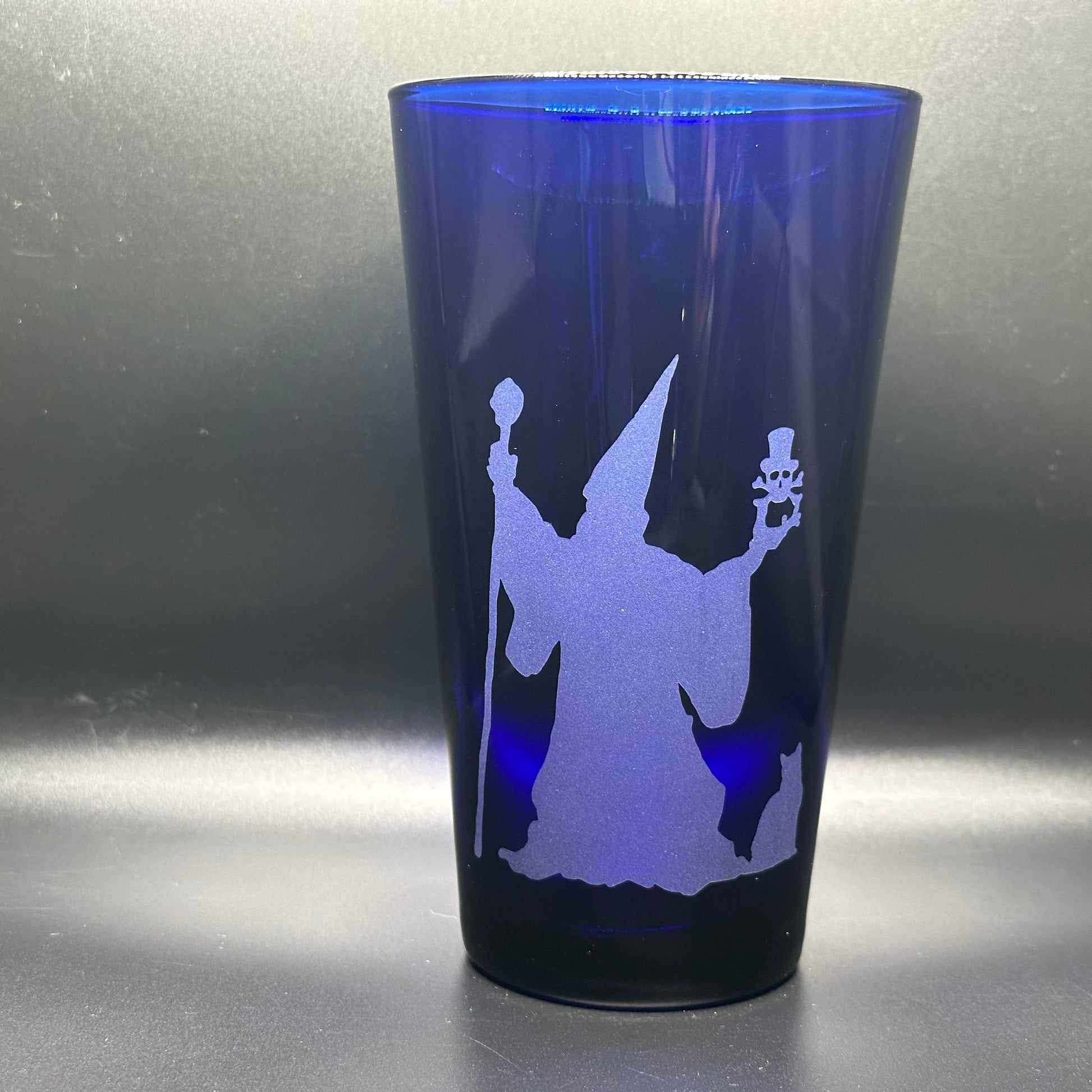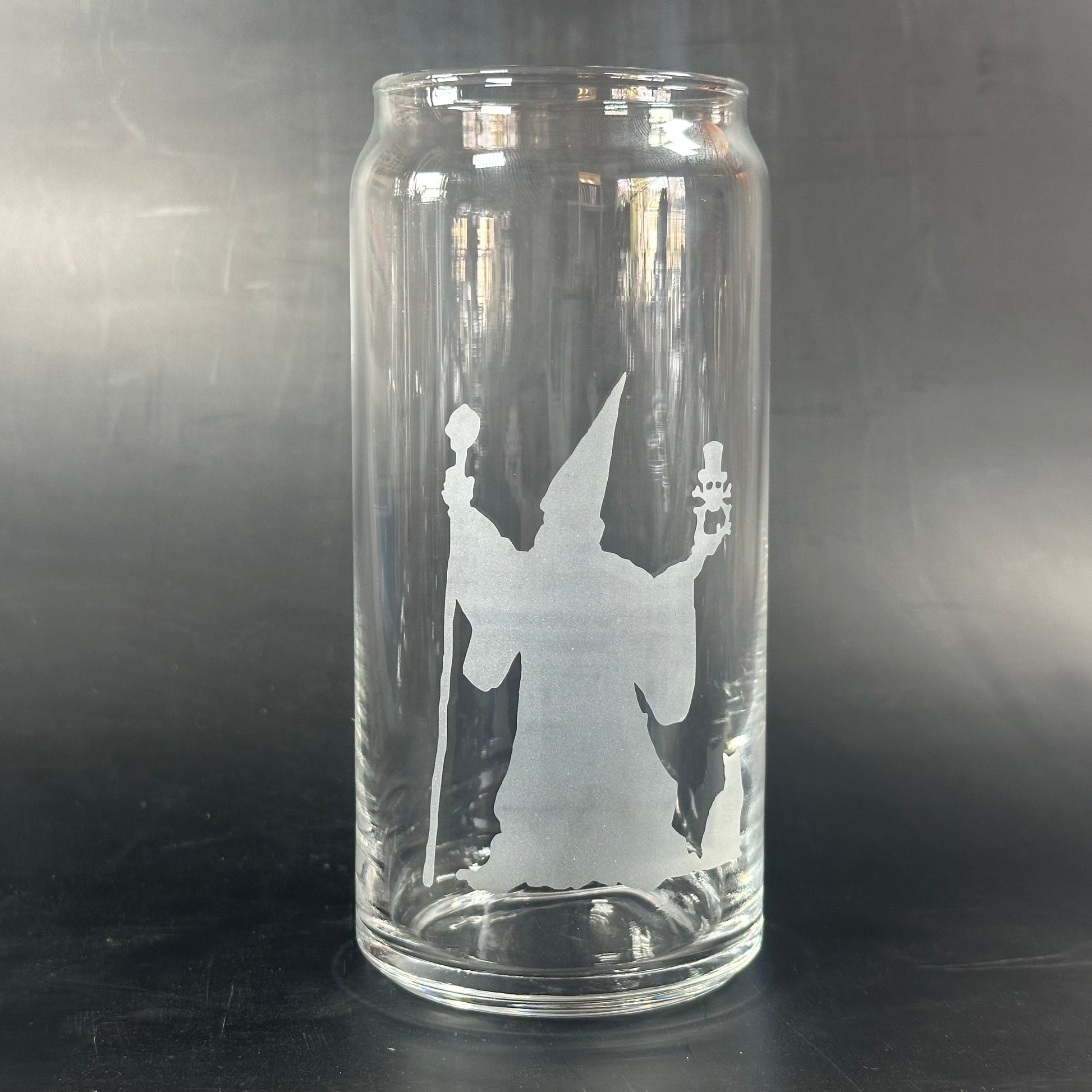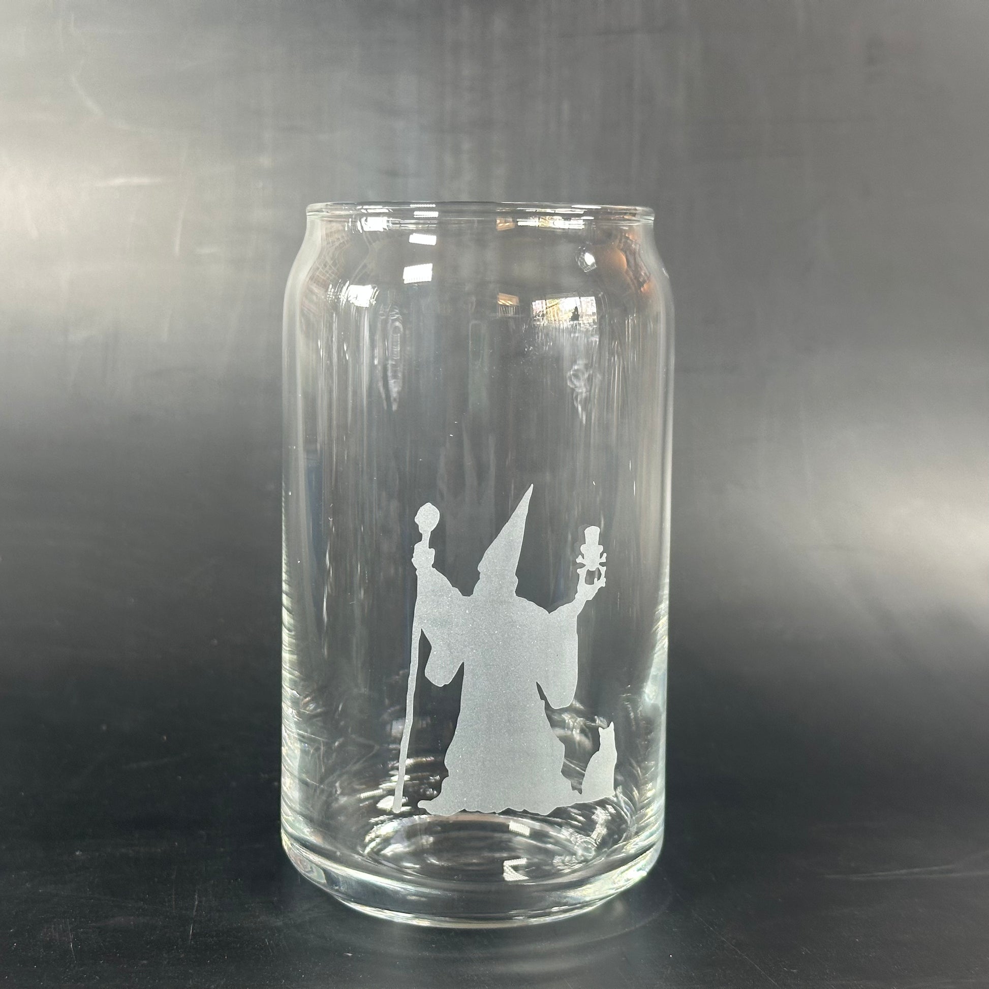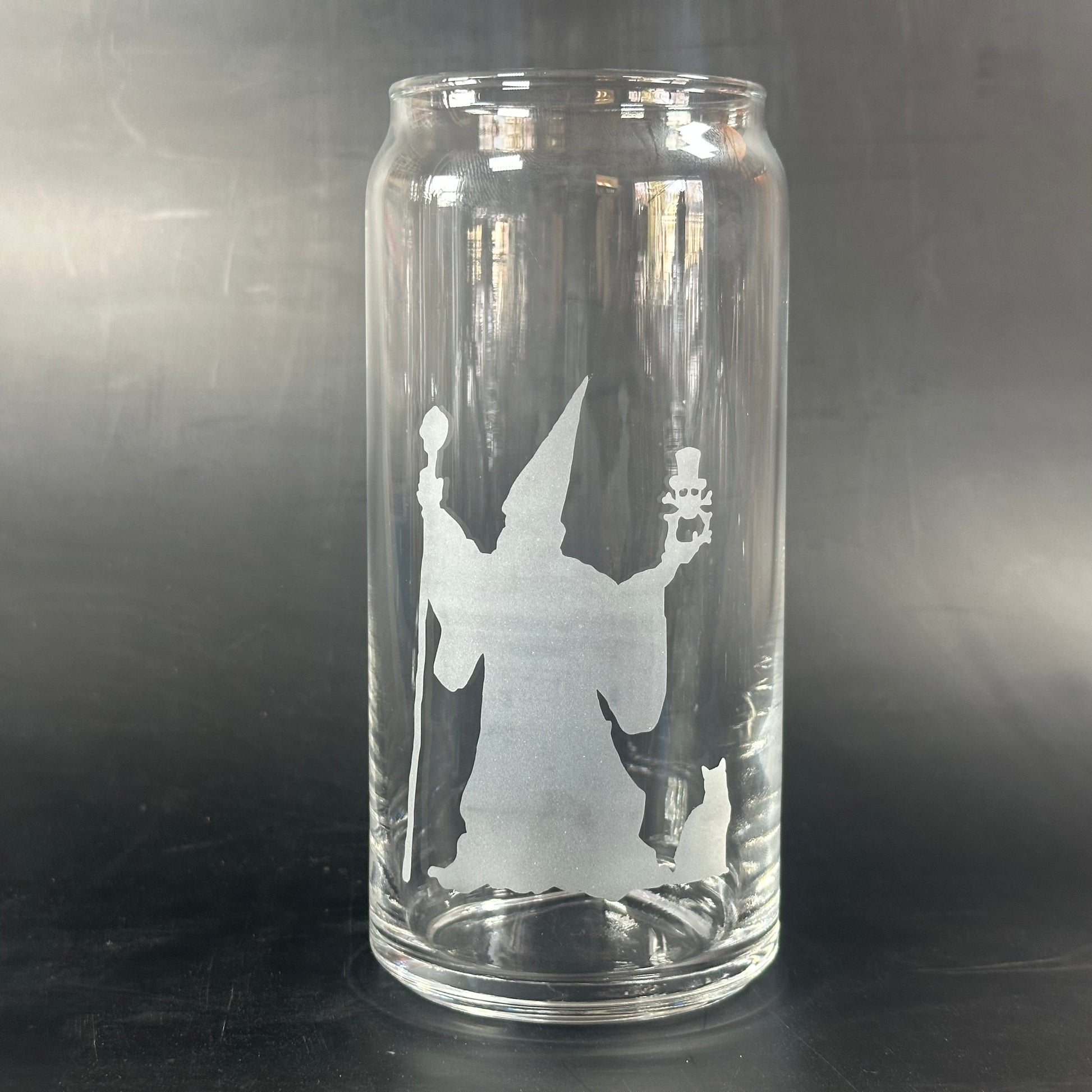 Unleash your inner magic with this wizard! This glass features a quirky wizard, a spooky skull, and a curious cat. Perfect for adding a touch of enchantment to your daily beverage. (Wand and spells not included!)