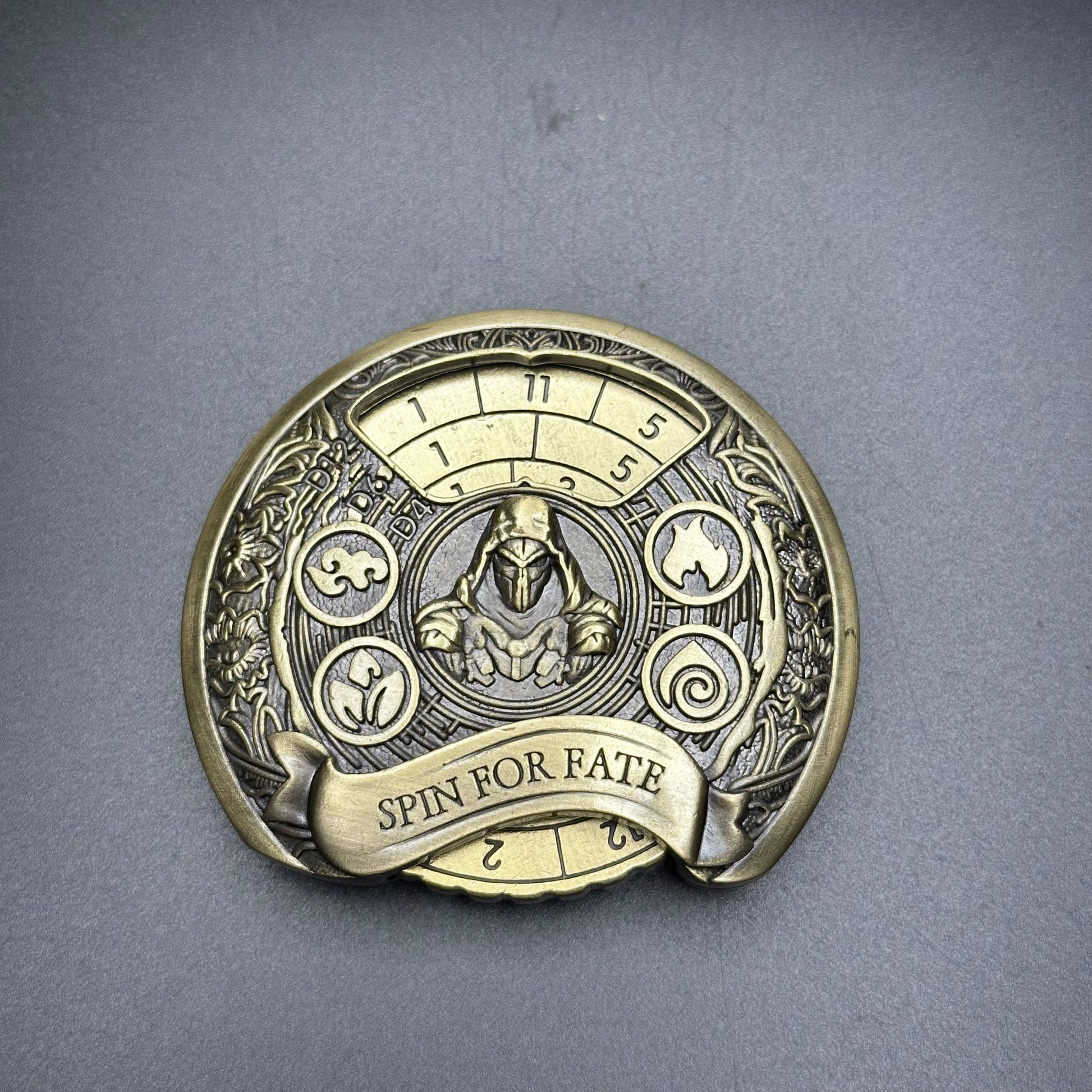 Add a dash of mystery to your game nights with The Veiled Oracle Dice Spinner. Featuring a hooded figure and the phrase "Spin For Fate," this spinner invites you to leave your luck in the hands of destiny. Perfect for adding suspense and fun as you spin to determine your next move.